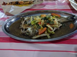今回たのんだのは伊勢海老(70リンギット)と白身魚(20リンギット)。エビの調理法はバターガーリックとチリソース。白身魚はスチームにしました。お店の人がおすすめの調理法をいってくるのでそれに合わせて魚の種類など決められます。